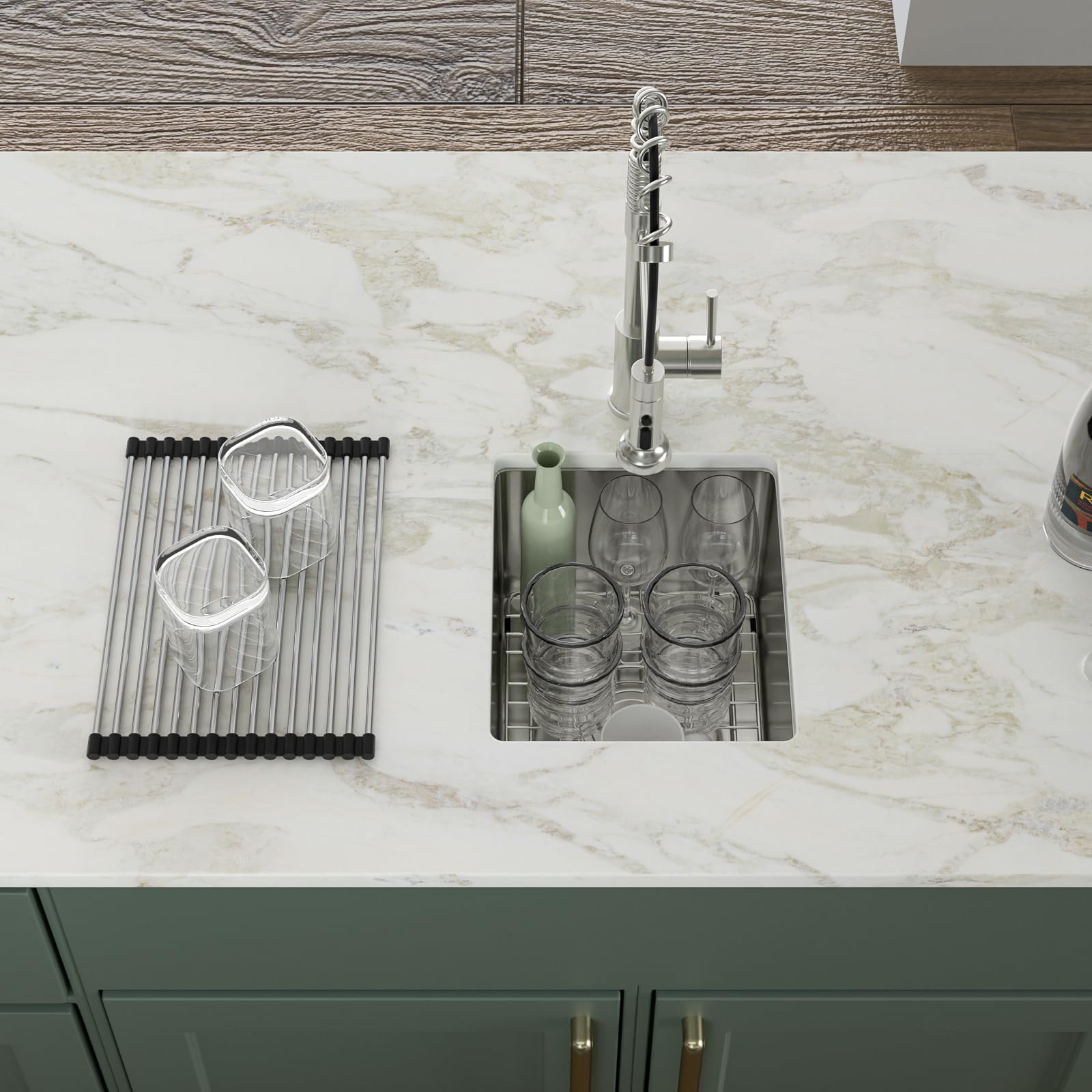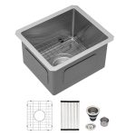 • ACCESSORIES INCLUDES: 13 inch bar sink, roll-up dish drying rack, drain assembly, bottom rinse grid, cutout template, mounting hardware and installation instruction.