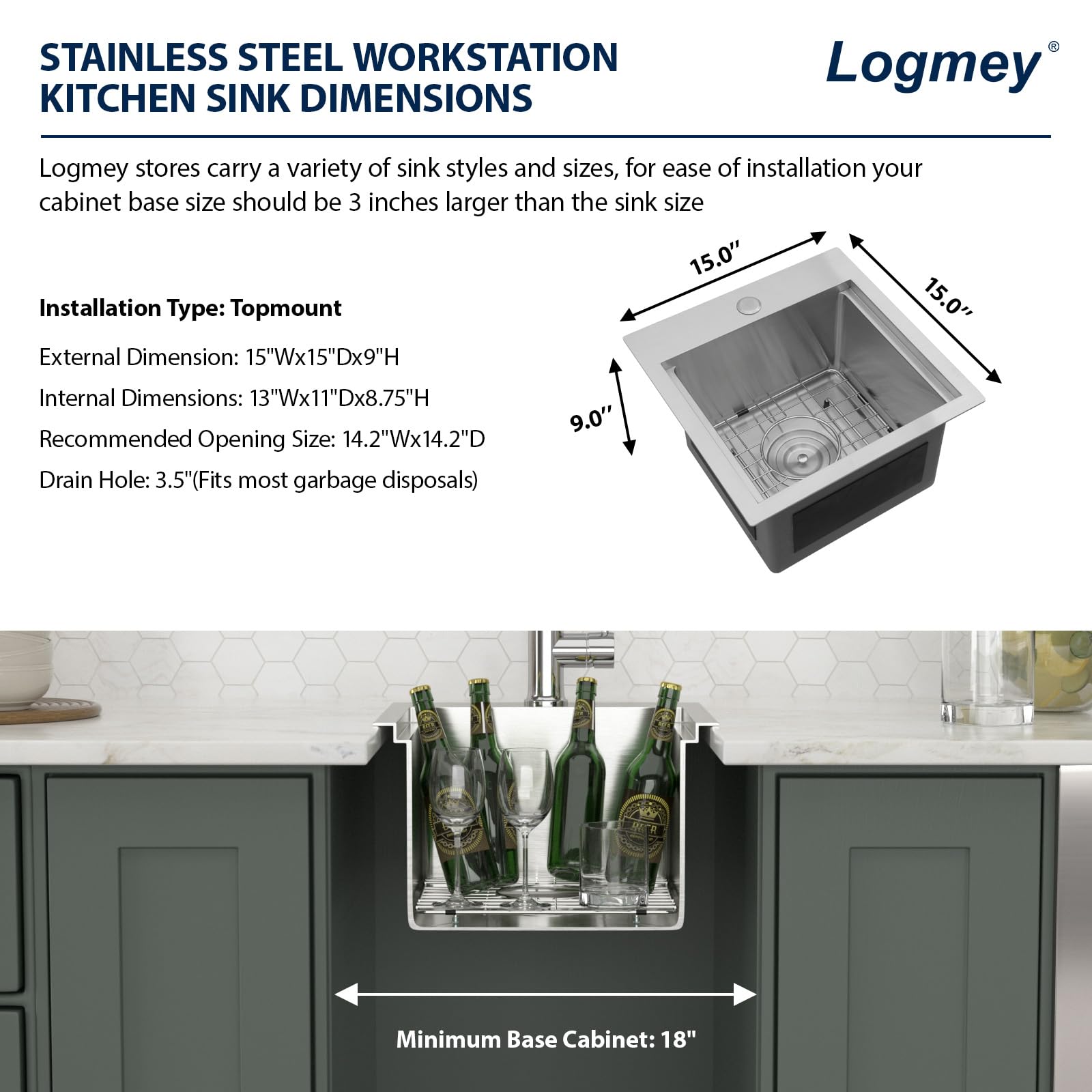 Logmey is a large brand with professional production lines and cutting-edge technology, adhering to the design concept of innovation, beauty and practicality, producing and creating a series of kitchen and bathroom products.15X15 Inches Drop In Workstation Kitchen Sink