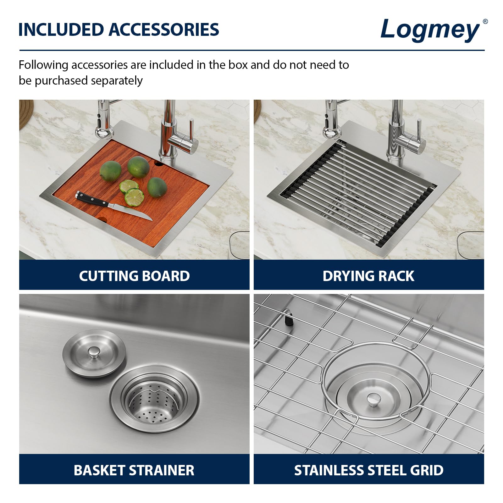 Logmey drop in workstation sink provide following accessories: