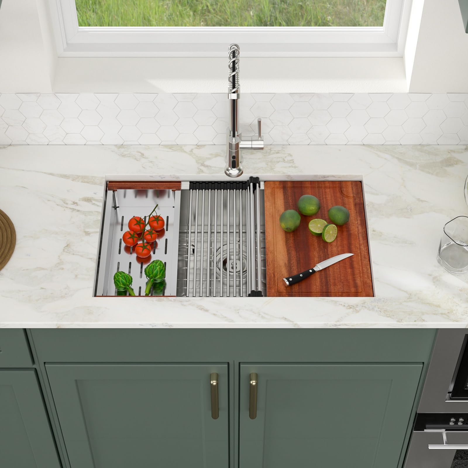 - Enhance your kitchen with our premium accessory set. Includes a roll-up rack, bottom rinse grid,Cutting Board and Basket Strainer Kit, all made of durable 304 stainless steel.