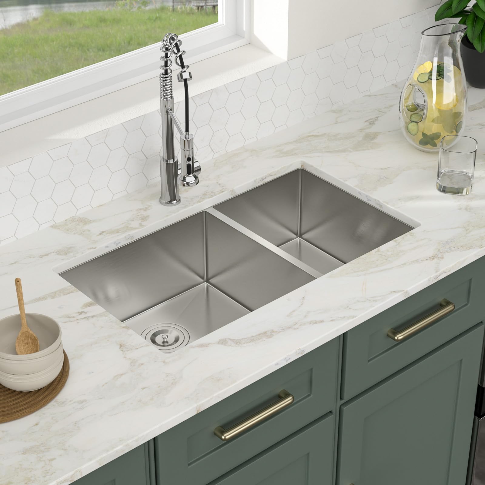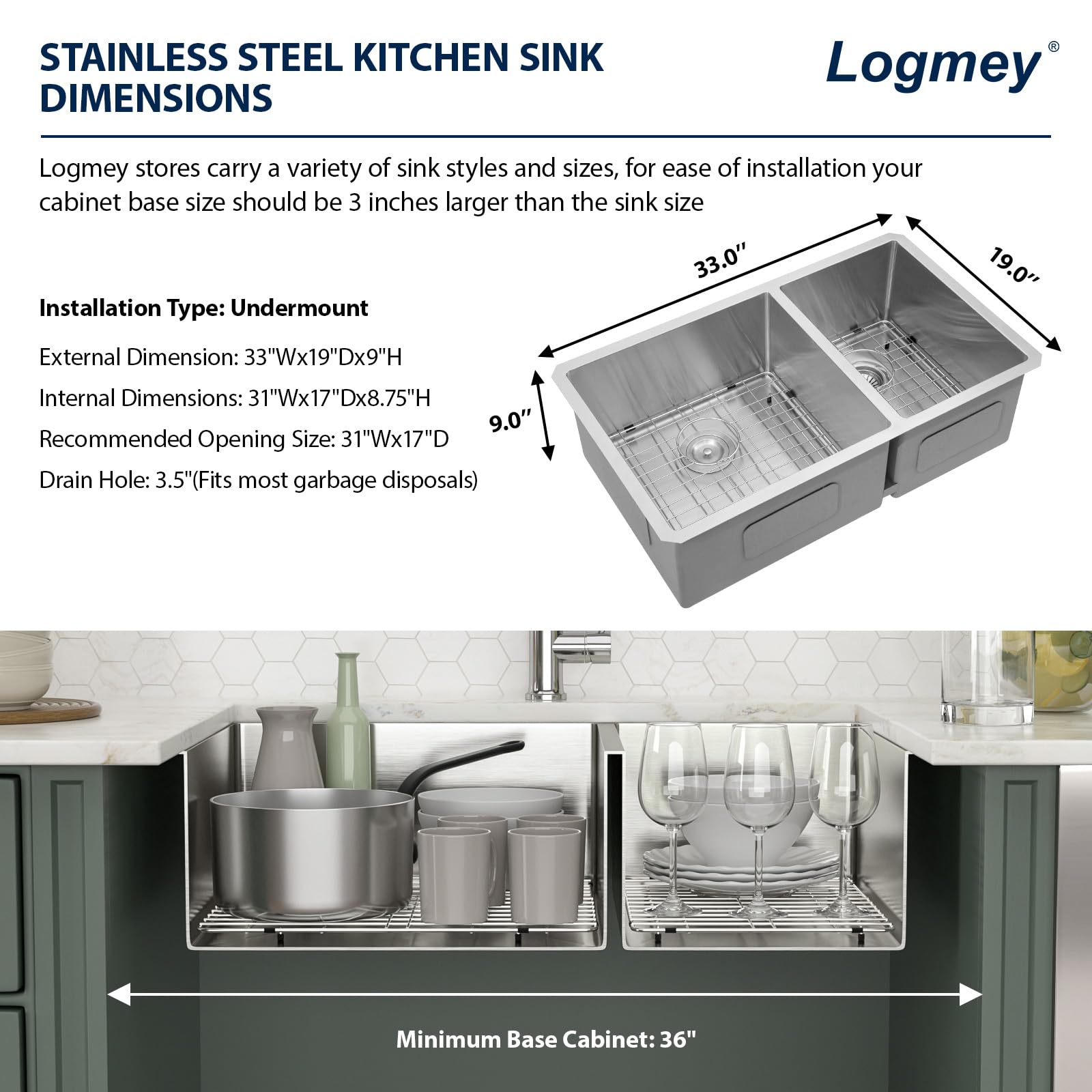 Logmey is a large brand with professional production lines and cutting-edge technology, adhering to the design concept of innovation, beauty and practicality, producing and creating a series of kitchen and bathroom products that are loved and trusted by customers and custom home builders.33×19 Inches Undermount Double Sink