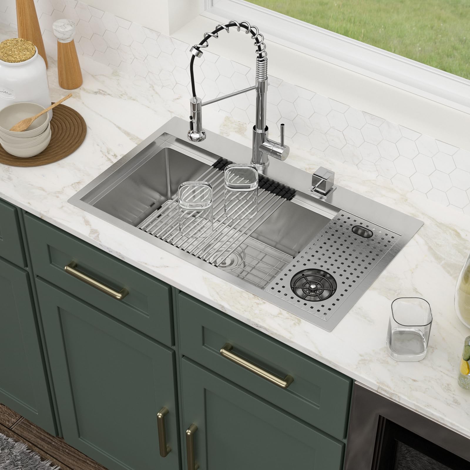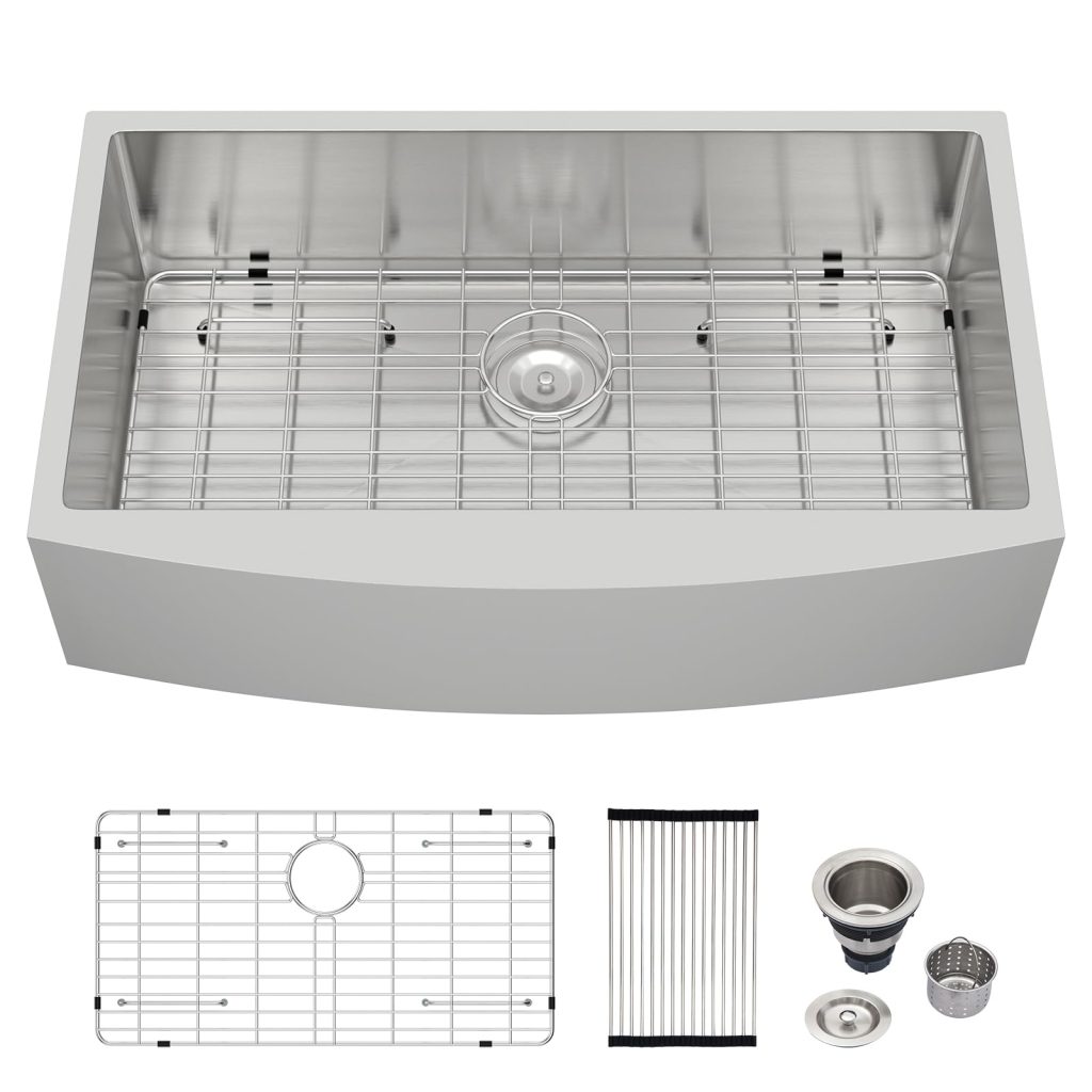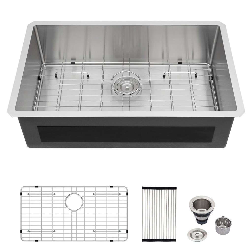 • Included Accessories: The package includes a 33×22 inch sink, roll-up drying rack, strainer basket, grid, drain assembly, cup washer, wooden cutting board, and a cover plate for added versatility.