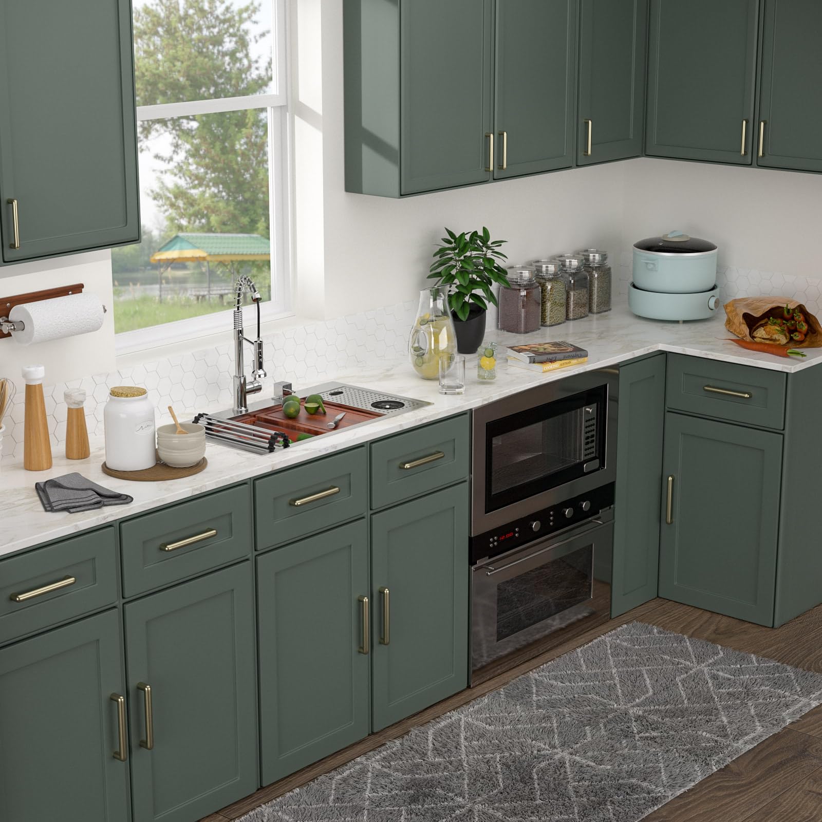 • Workstation with Cup Washer: The built-in workstation includes a handy cup washer, making meal prep and cleanup more efficient. Slide the accessories across the sink to save space and enhance functionality.