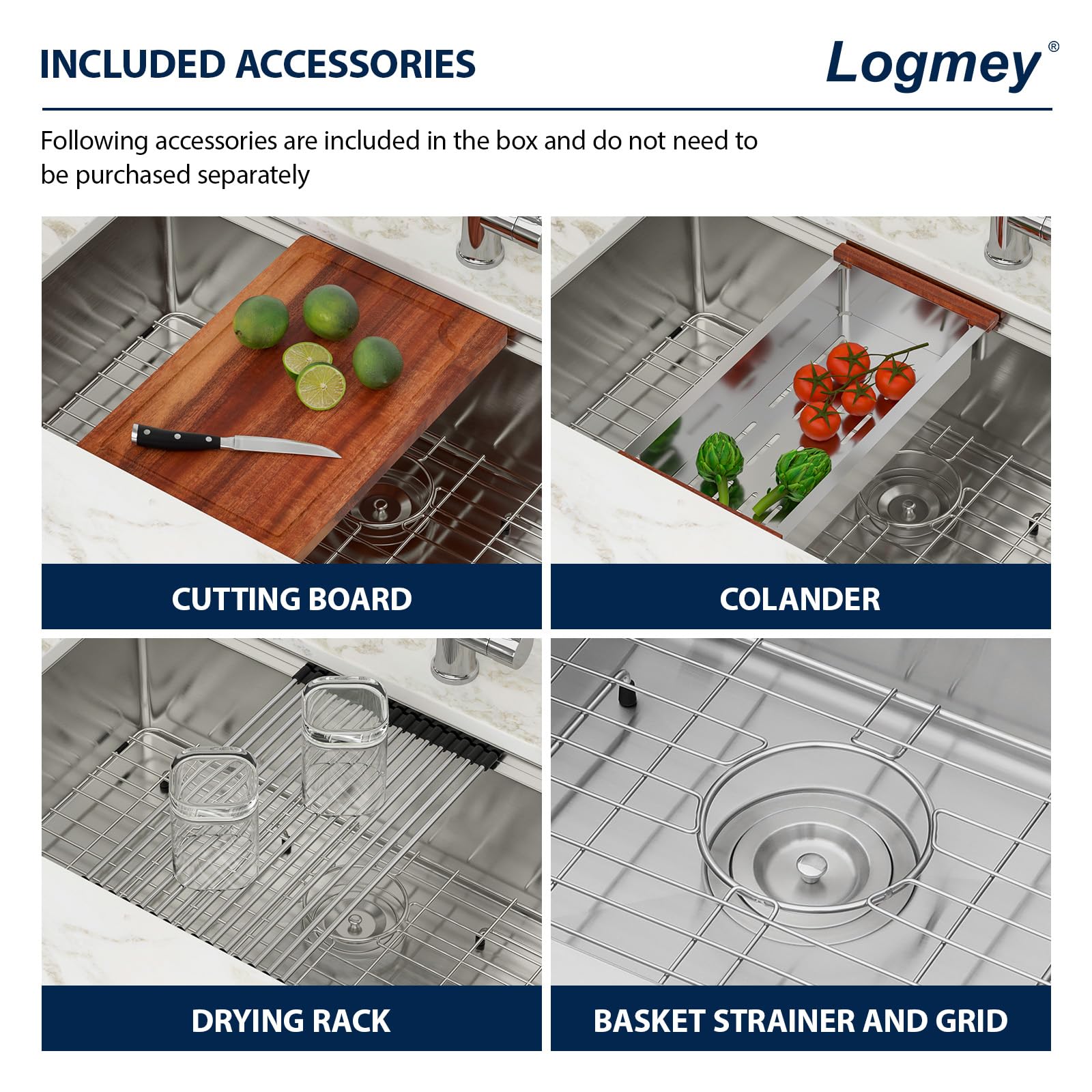 - Enhance your kitchen with our premium accessory set. Includes a roll-up rack, bottom rinse grid,Cutting Board and Basket Strainer Kit, all made of durable 304 stainless steel.