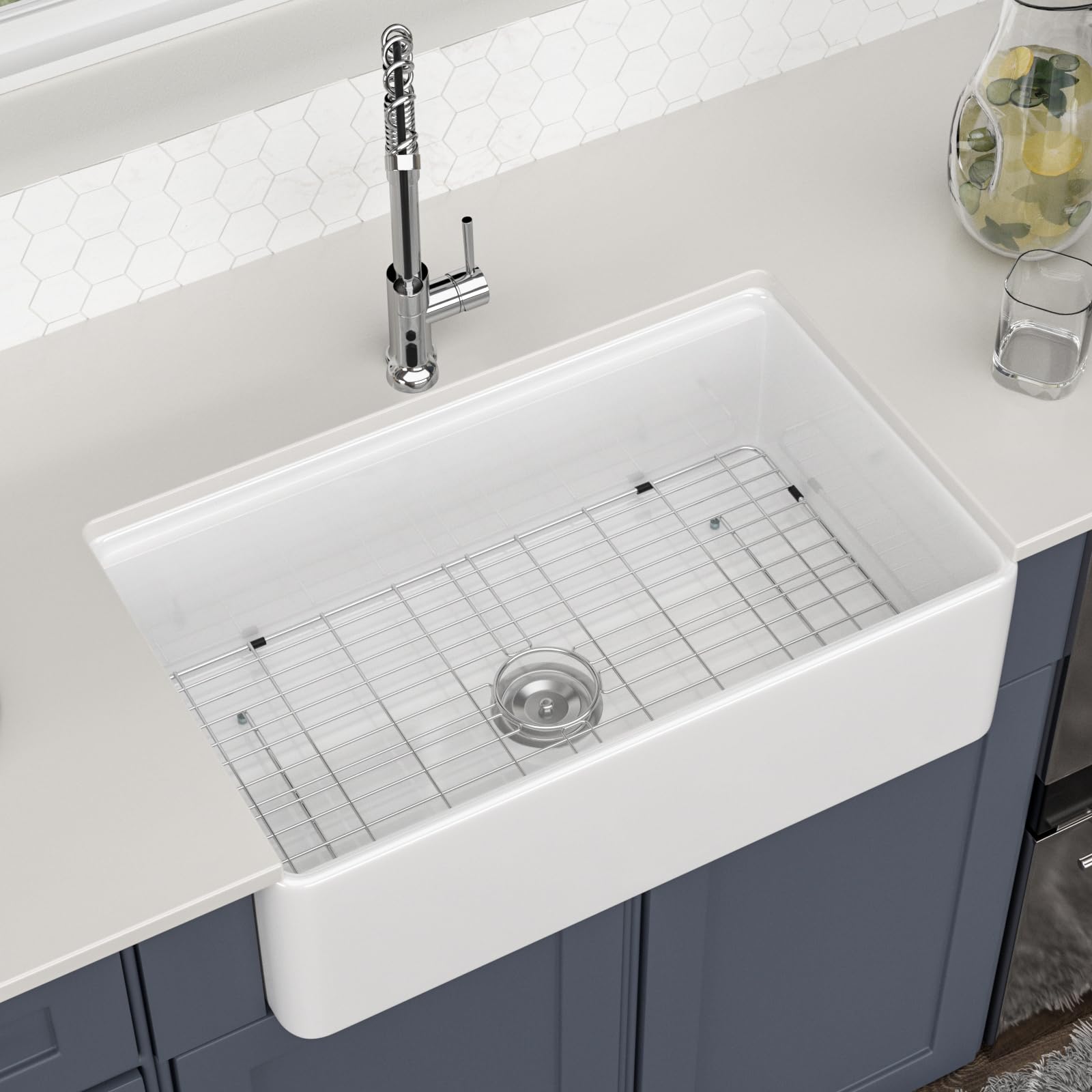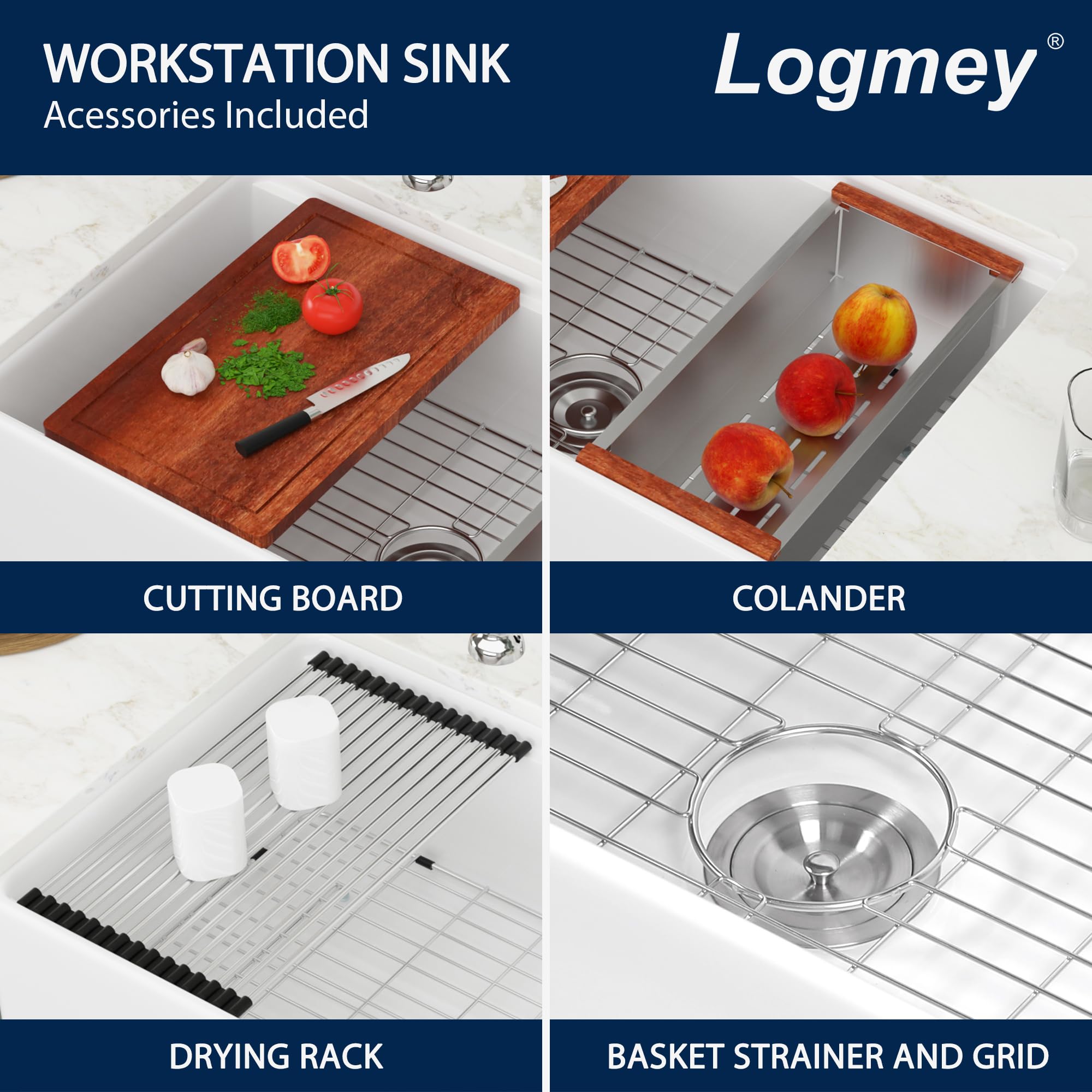 - Premium Accessories: The white farmhouse kitchen sink includes a stainless steel bottom grid,Cutting Board,Roll Drying Rack,Colander and kitchen sink drain assembly.If you have any questions, please feel free to find us. Excellent after-sales team at your service