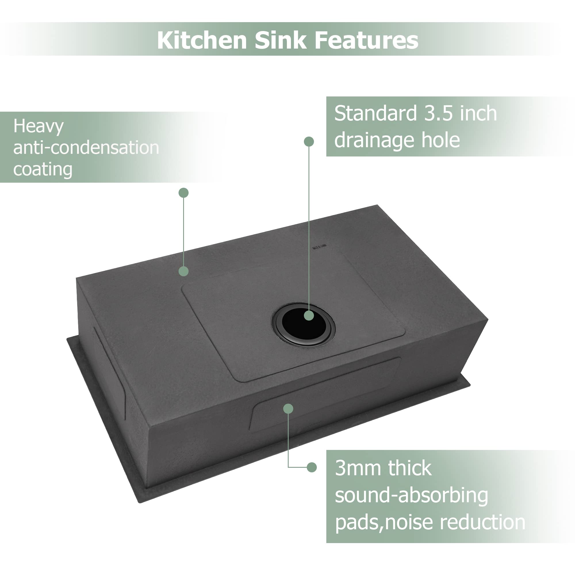- UNIQUE DESIGN: The back of this 30 inch stainless steel undermount kitchen sink features an anti-condensation coating and a 3mm thick noise-reducing rubber mat that prevents damage to the cabinet from condensation formed by temperature changes, as well as reducing noise when the undermount sink is in operation. The X-shaped water guide line ensures quick cleaning and complete drainage.