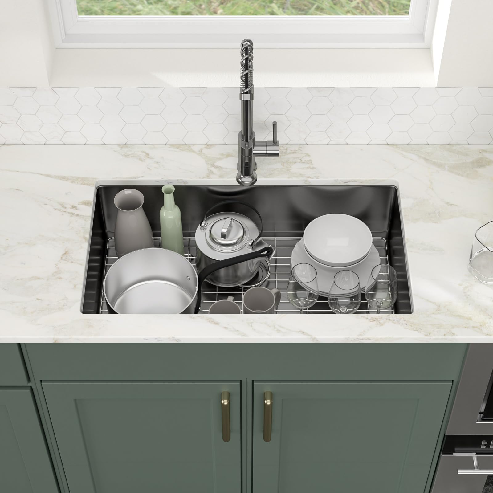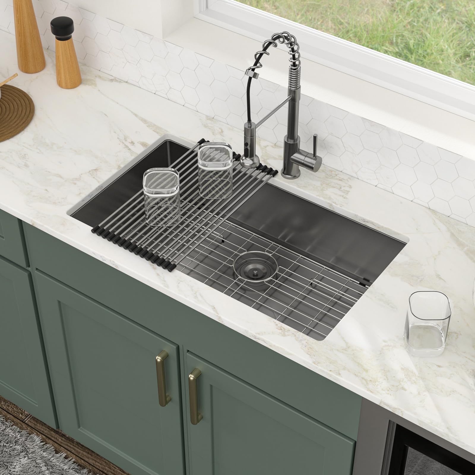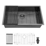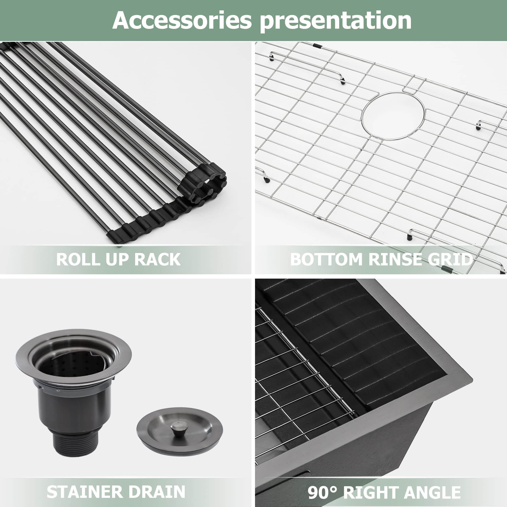 - ACCESSORIES INCLUDES: 33 inch undermount sink, roll-up dish drying rack, drain assembly, bottom rinse grid, cutout template, mounting hardware and installation instruction.