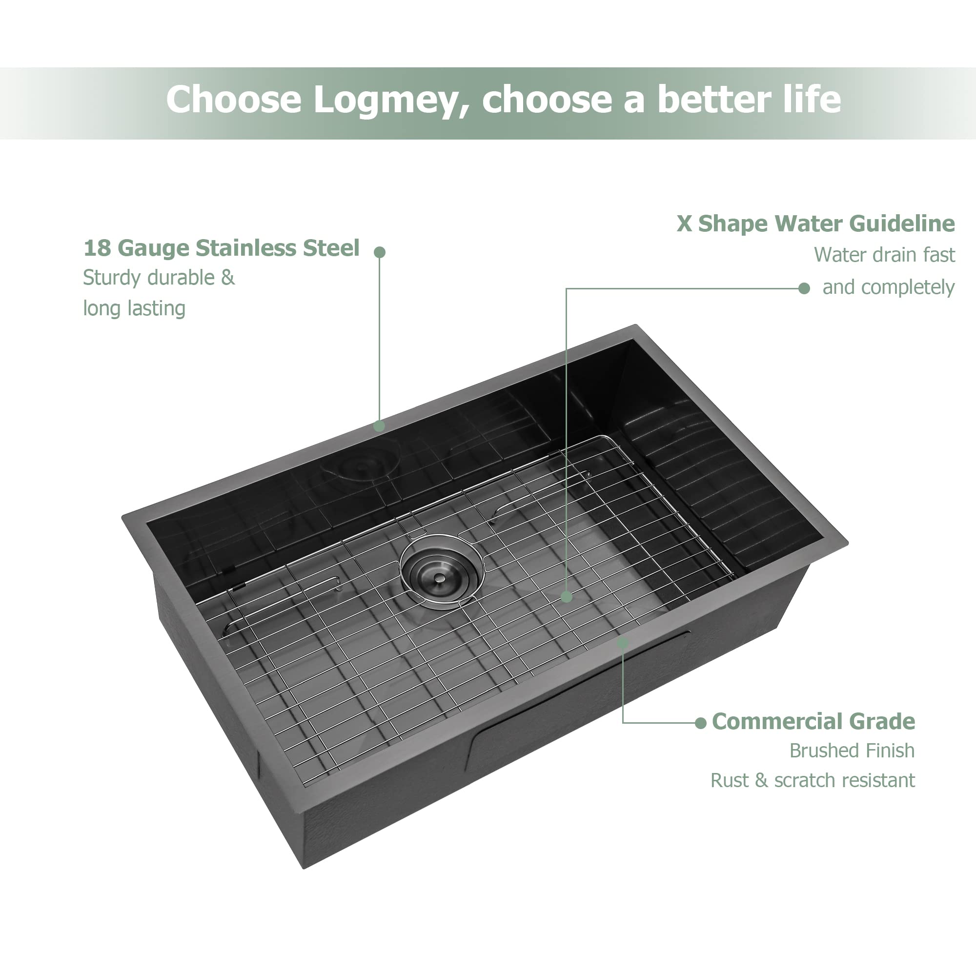 - SOLID CONSTRUCTION: Logmey undermount sinks is constructed of heavy duty 16 gauge SUS304 stainless steel. Stainless Steel kitchen sink with commercial-grade brushed finish resists dents and scratches, is easy to clean and has a long service life.