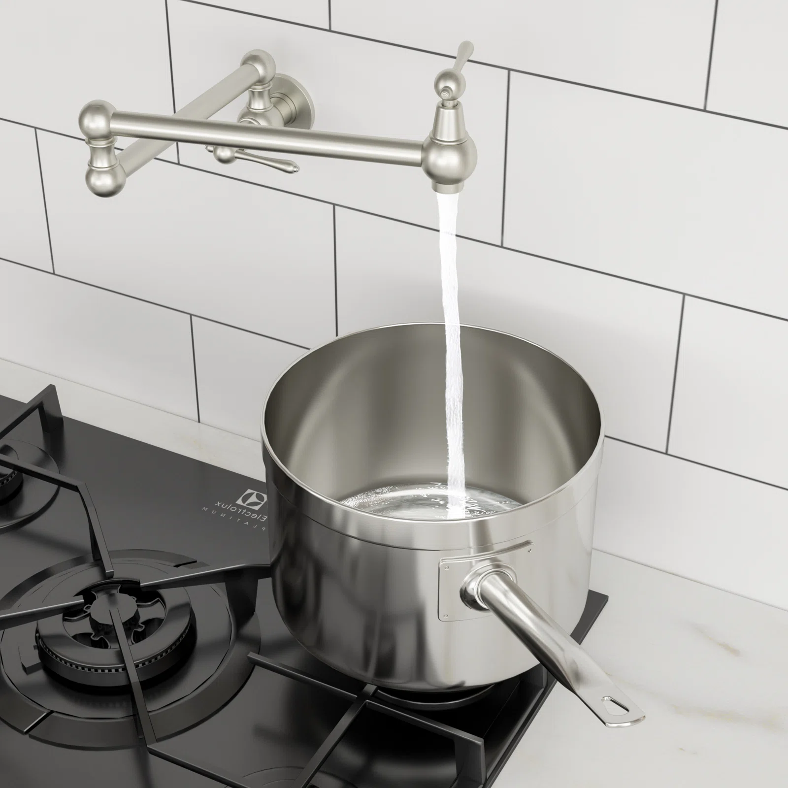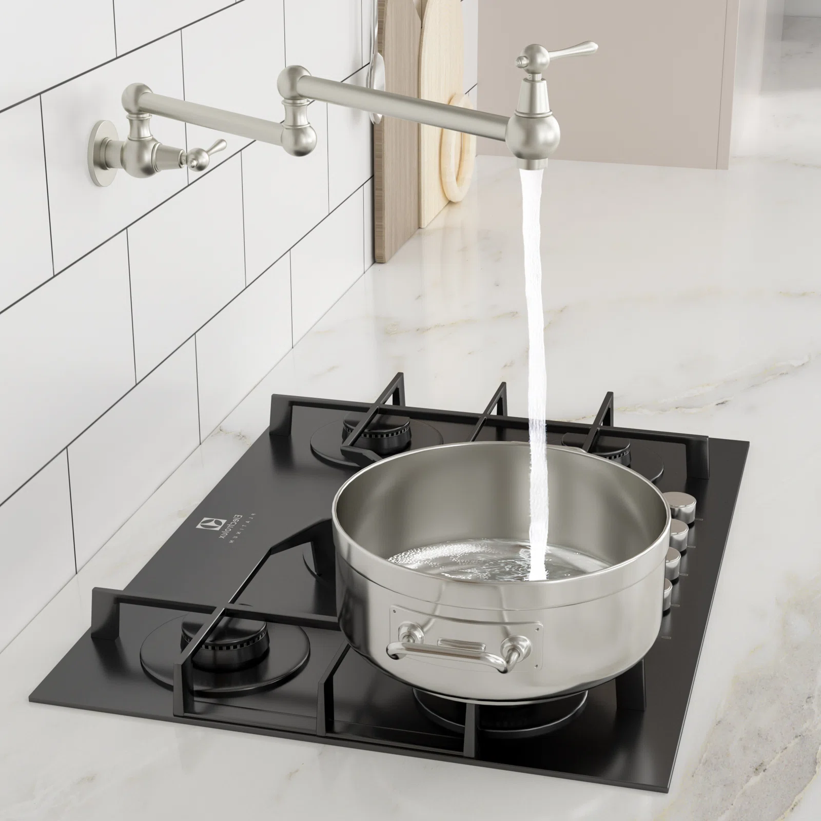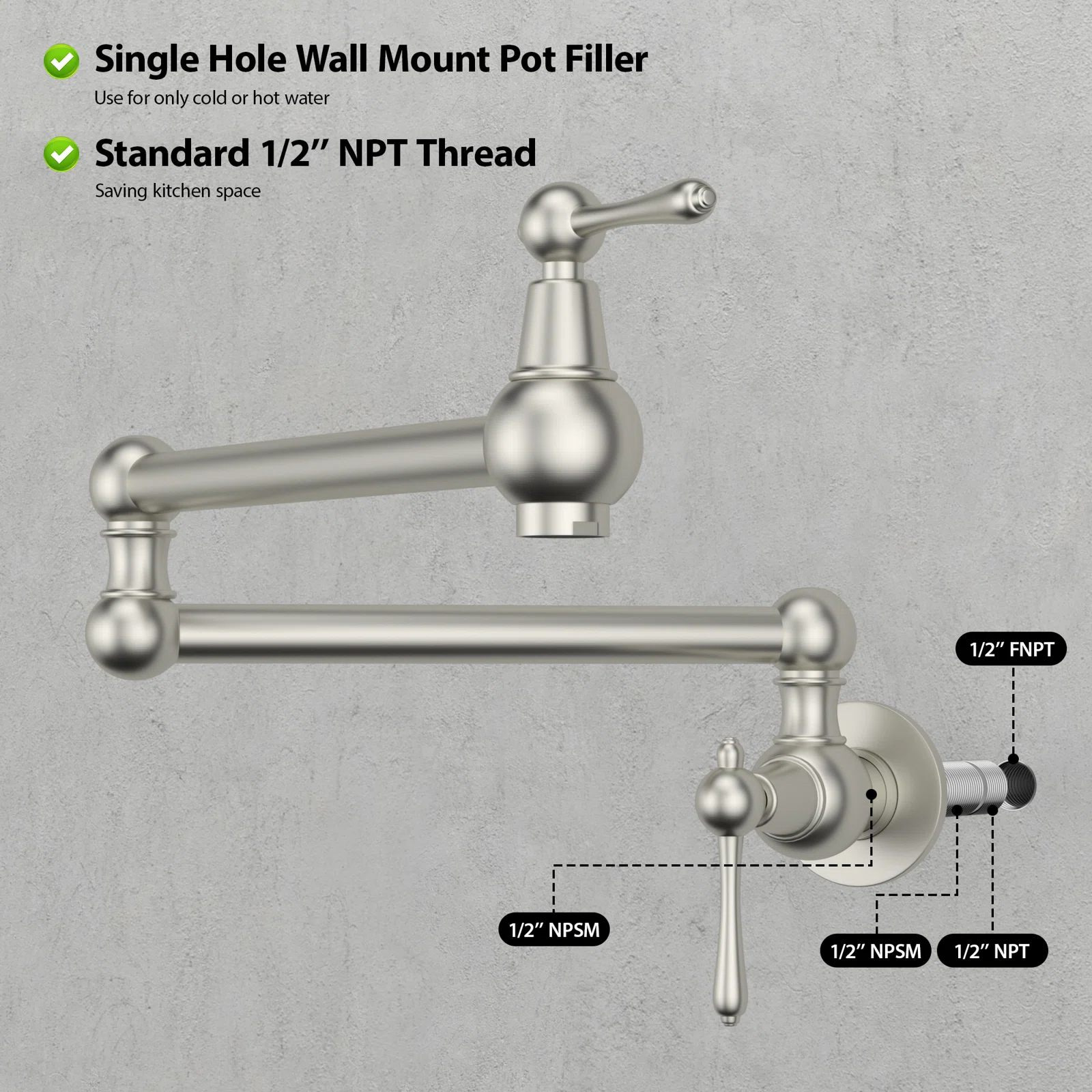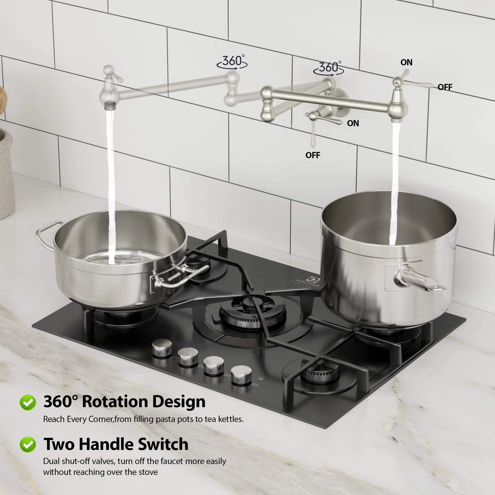 - The pot filler kitchen faucet is designed with a 360-degree rotating feature, enabling quick and easy filling of pots while on your stove or cooktop. Enjoy the flexibility and convenience of filling your cookware with ease.