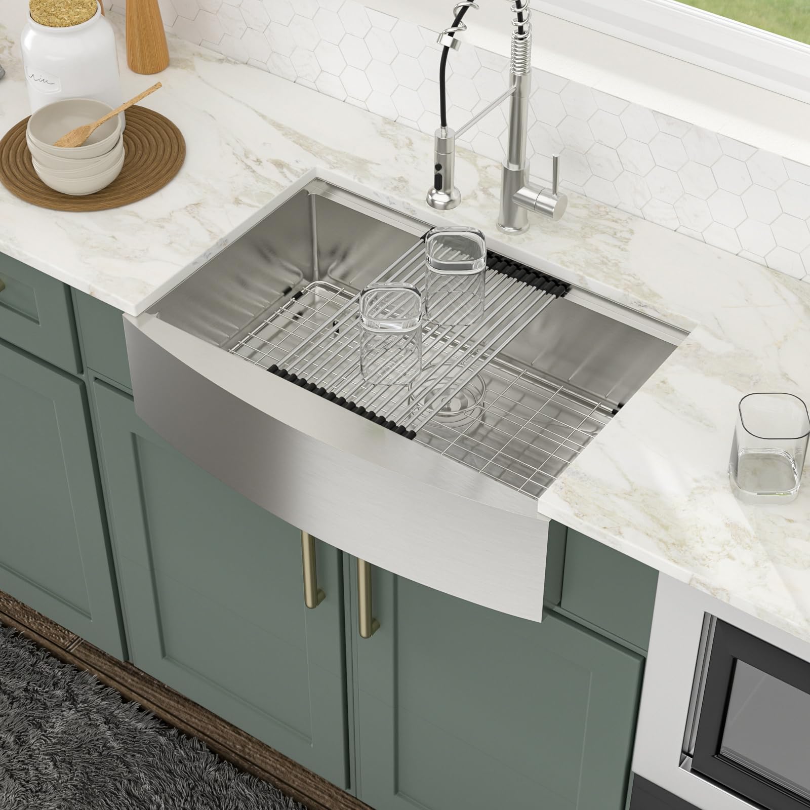 - ACCESSORIES INCLUDES: 30 inch apron front sink, cutting board, colander, roll-up dish drying rack, drain assembly, bottom rinse grid, cutout template, mounting hardware and installation instruction.