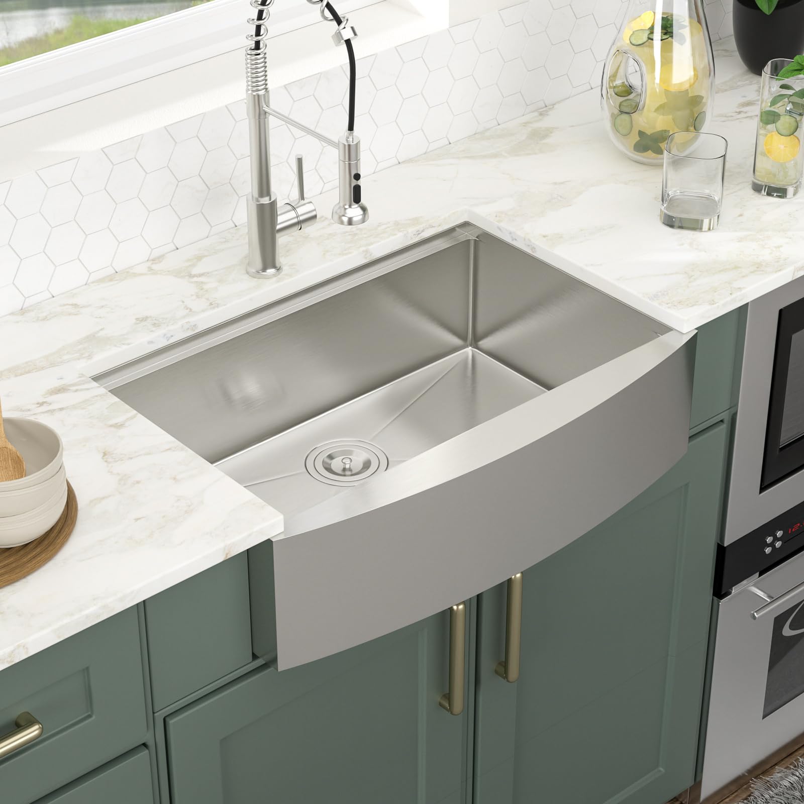 - UNIQUE DESIGN: The back of this 30 inch stainless steel farmhouse sink features an anti-condensation coating and a 3mm thick noise-reducing rubber mat that prevents damage to the cabinet from condensation formed by temperature changes, as well as reducing noise when the farm sink is in operation. The X-shaped water guide line ensures quick cleaning and complete drainage.