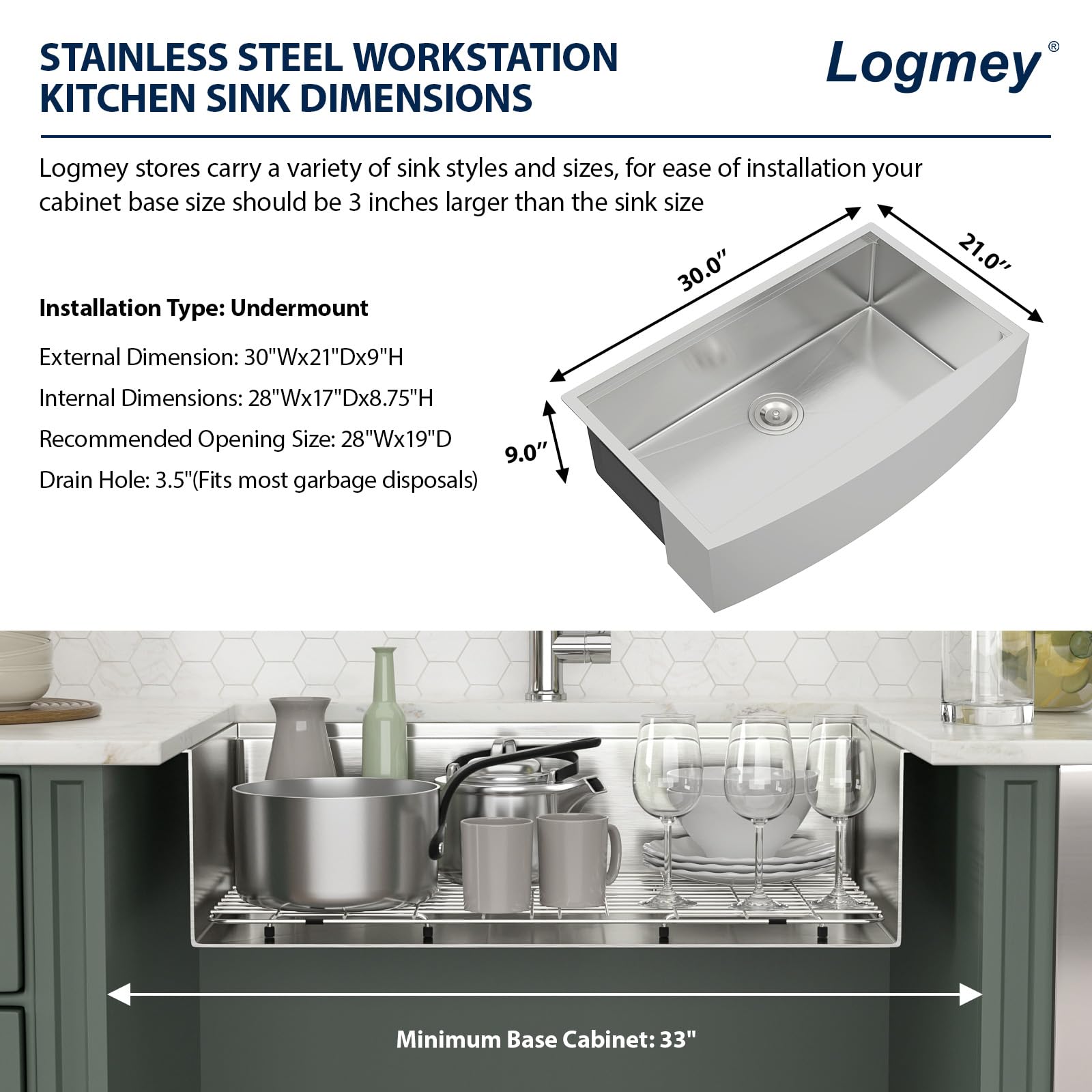 - DEMENSIONS: Exterior Dimensions: 30″Wx21″Dx9″H, Interior Bowl Dimensions: 28″Wx17″Dx8.75″H, Note: The height of the apron only 8 inch, it is 1″ shorter than the bowl height. Minimum Cabinet Base Size: 33″W. Farmhouse Sink rear set 3.5″ drain hole that matches most kitchen appliances and fits the most Common Garbage Disposal System