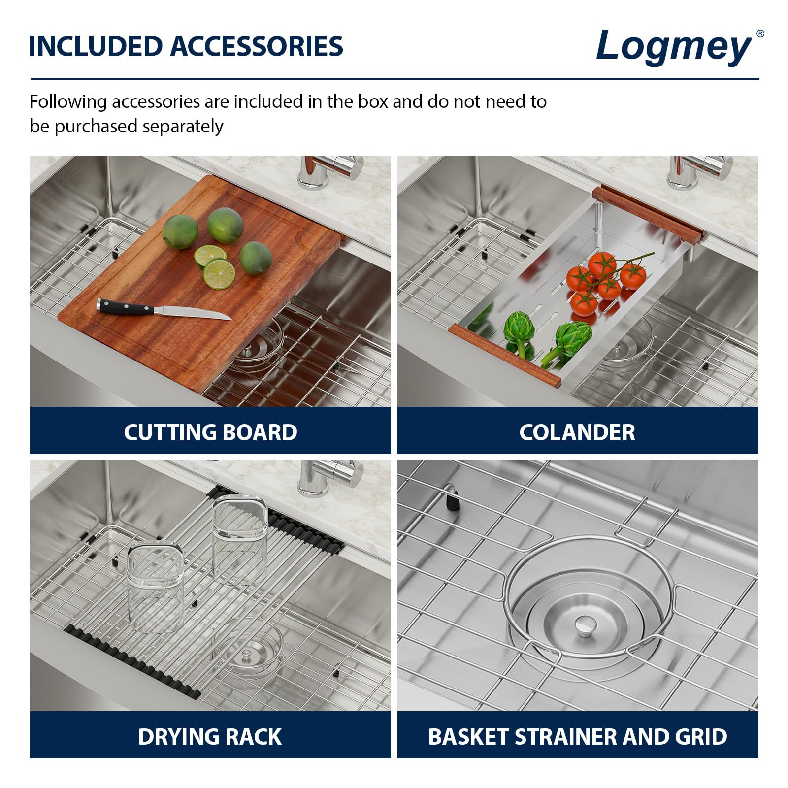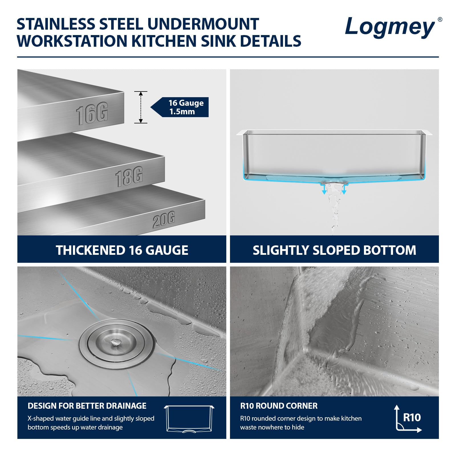 - SOLID CONSTRUCTION: Logmey farmhouse kitchen sink workstation is constructed of heavy duty 16 gauge SUS304 stainless steel. Stainless steel farmhouse sink with commercial-grade brushed finish resists dents and scratches, is easy to clean and has a long service life.
