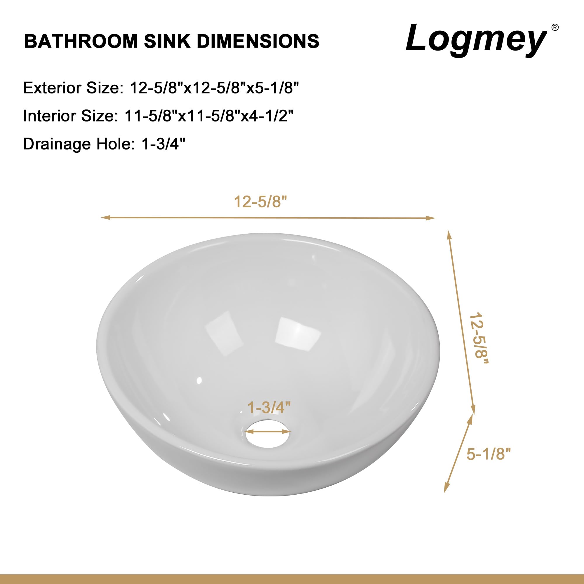 - Round Vessel Sink Exterior Size:12-5/8″Wx12-5/8″Hx5-1/8″H. Interior Size: 11-5/8″Wx11-5/8″Dx4-1/2″H.